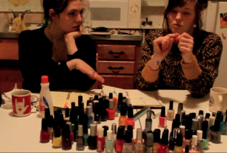 Ethnographic video footage of interview with Joanna van Rensselear and Gwyneth Anderson. The original interview looks at Joanna van Rensselear’s nail polish collection and chronicles the three participants doing their nails. The subsequent video looks at the gestural affects of homosocial space. Music courtesy of Coughs “Fright Makes Right” from album, Fright Makes Right, on Load Records, 2005.